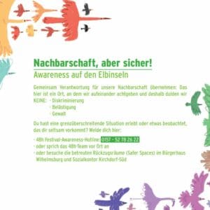 Den Organisator:innen von 48h Wilhelmsburg wurde deshalb vor einigen Jahren bewusst, dass es während des Festivals eine Anlaufstelle für Betroffene von übergriffigen Situationen braucht – und richteten 2019 ein Awareness-Team ein. Die Gäste des Festivals können sich jederzeit an dieses geschulte Team wenden: Es ist während des Festivals über eine Hotline erreichbar und hat ein Mietauto zur Verfügung, um schnell vor Ort zu sein. Im Bürgerhaus Wilhelmsburg und im Sozialkontor Kirchdorf-Süd gibt es zudem Safer Spaces, die Betroffene ansteuern können. Über Flyer, die Website, Social Media und Plakate werden die Gäste auf diese Anlaufstelle und auf das Konzept Awareness aufmerksam gemacht.