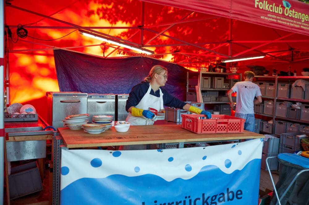 Die Mehrweglösung ist sehr personalintensiv und erfordert vor allem körperlich anstrengende Arbeit. Es braucht deshalb Mitarbeitende, die dieser Herausforderung gewachsen sind. Beim Transport des Geschirrs sollen zukünftig E-Lastenräder unterstützen. Eine weitere Herausforderung ist die Kommunikation mit den Besucher*innen: Nur mit ihrer Hilfe bei der Rückgabe und Sortierung des Geschirrs funktioniert das System reibungslos. Oft sind die Besucher*innen jedoch unsicher, wie alles abläuft, übersehen die Rückgabestationen und geben das schmutzige Geschirr wieder bei den Ständen ab. Die Veranstaltenden bemühen sich deshalb um eine genaue Anleitung und großflächige Beschilderung der Rückgabestationen, idealerweise nachhaltig produziert und gleichzeitig wasserfest. Auch die Gastronom*innen haben viele Fragen und müssen sich erst an die neuen Strukturen gewöhnen.