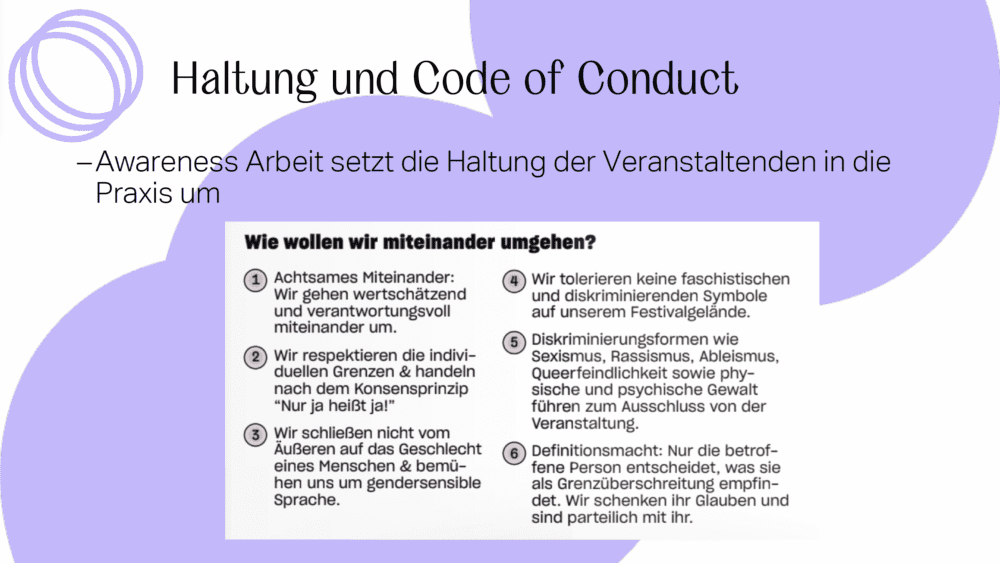 Gemeinsam mit dem Verein Act Aware e.V. wurde 2021 ein Awareness Konzept entwickelt und seitdem stetig weiterentwickelt. Es umfasst einen Code of Conduct, Awareness Richtlinien, Awareness Teams, einen Awareness Point und die Möglichkeit der direkten Kontaktaufnahme. Weiter wird das Thema Awareness auch im Programm thematisiert.