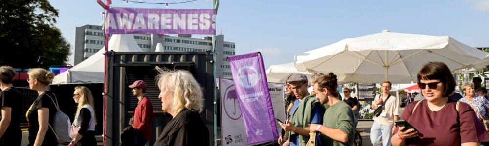 Besucher:innen von Festival und Konferenz werden über die Webseite und Soziale Medien informiert. Abonnenten der Festival App erhalten täglich eine Push-Benachrichtigung. Vor Ort klären Plakate, Flyer und Banner auf. Hier ermöglicht die angegebene Telefonnummer auch die direkte Kontaktmöglichkeit mit dem Awareness Team. In Programmpausen der Konferenz werden die Screens zum Sensibilisieren und für die Aufklärung genutzt.