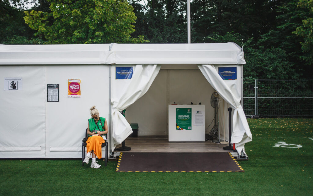 • Awareness-Teams mit geschultem Personal, stationär und mobil, sichtbar durch grüne Westen. Sie wurden im Rahmen eines Safeguarding-Programms qualifiziert und standen als erste Ansprechpersonen bei Konflikten, Diskriminierung oder Belästigung bereit.